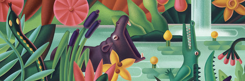 Choisissez votre clan parmi les Hippopotames et les Crocodiles, récupérez vos 2 totems et placez vos 15 dominos en trois piles égales devant vous. Placez ensuite au hasard les 9 tuiles plateaux en un carré de 3x3 au centre de la table.