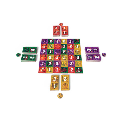 Choisissez votre clan parmi les Singes, Serpents, Toucans et Tigres, récupérez votre totem et placez vos dominos en deux piles égales devant vous. Placez ensuite au hasard les 9 tuiles plateaux en un carré de 3x3 au centre de la table.